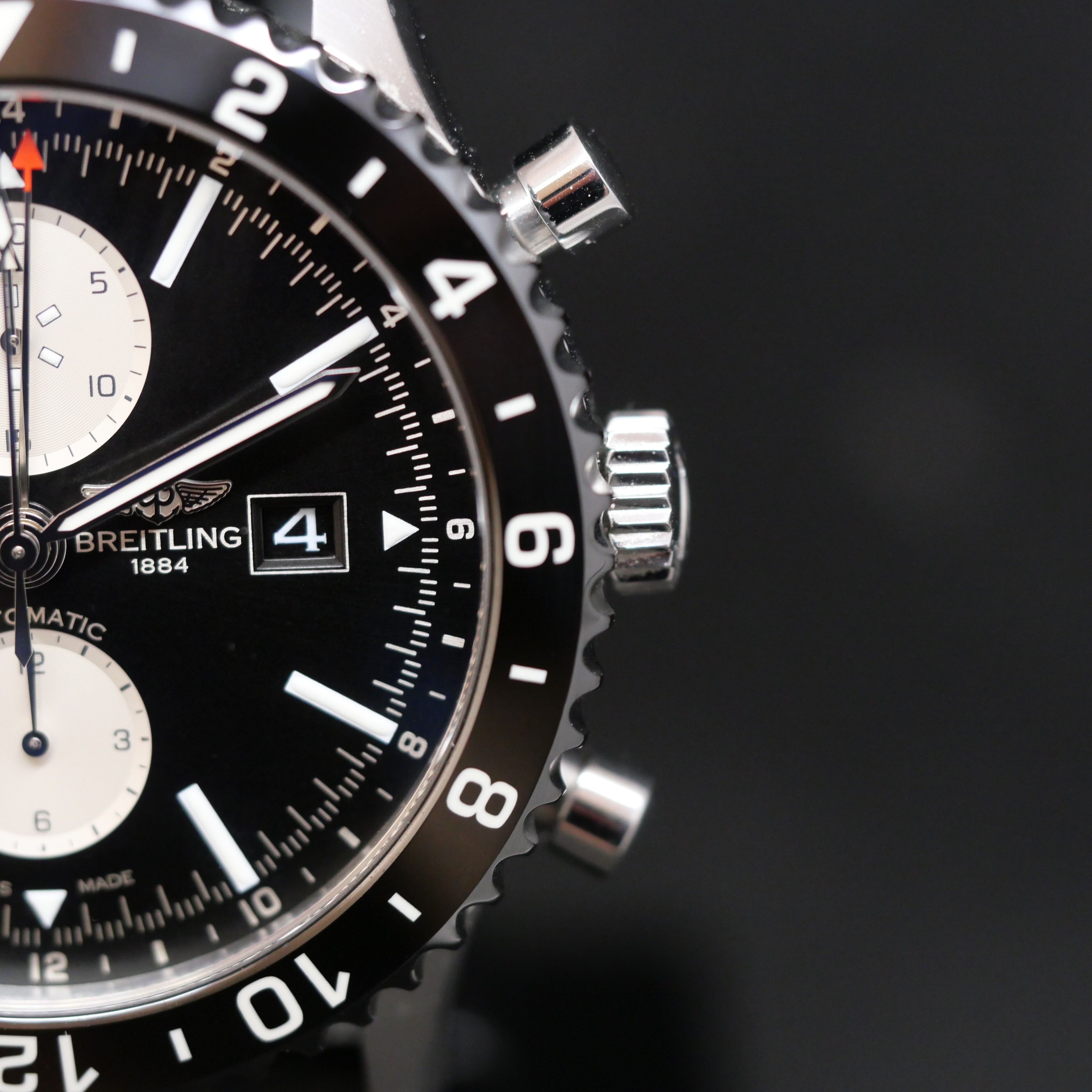 Dotée d’un chronographe haute précision, d’une fonction GMT permettant de suivre plusieurs fuseaux horaires, et d’un calibre automatique certifié COSC, cette Chronoliner offre une fiabilité exemplaire. Son aiguille GMT à pointe rouge et sa lunette graduée 24 h assurent une lecture intuitive de l’heure partout dans le monde.