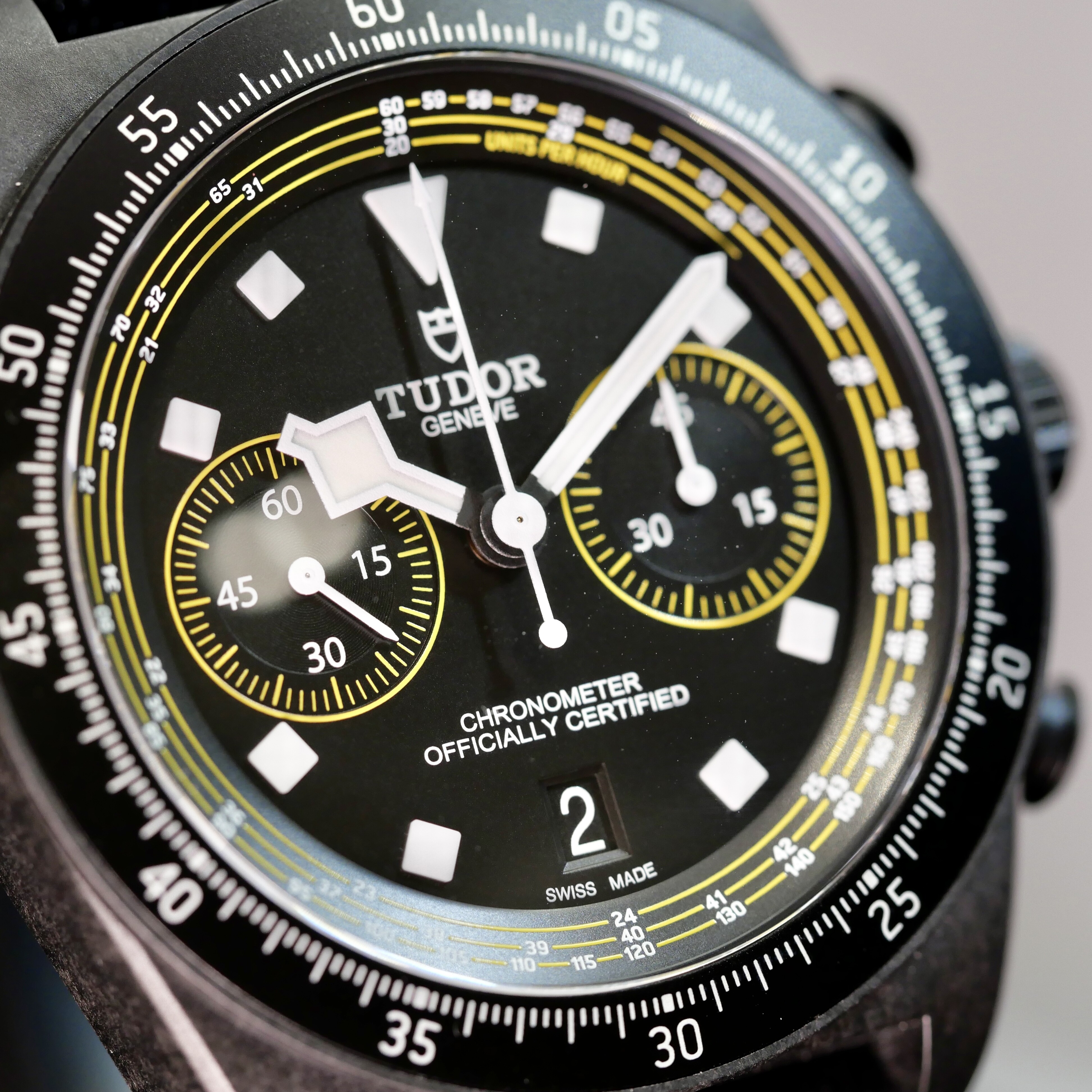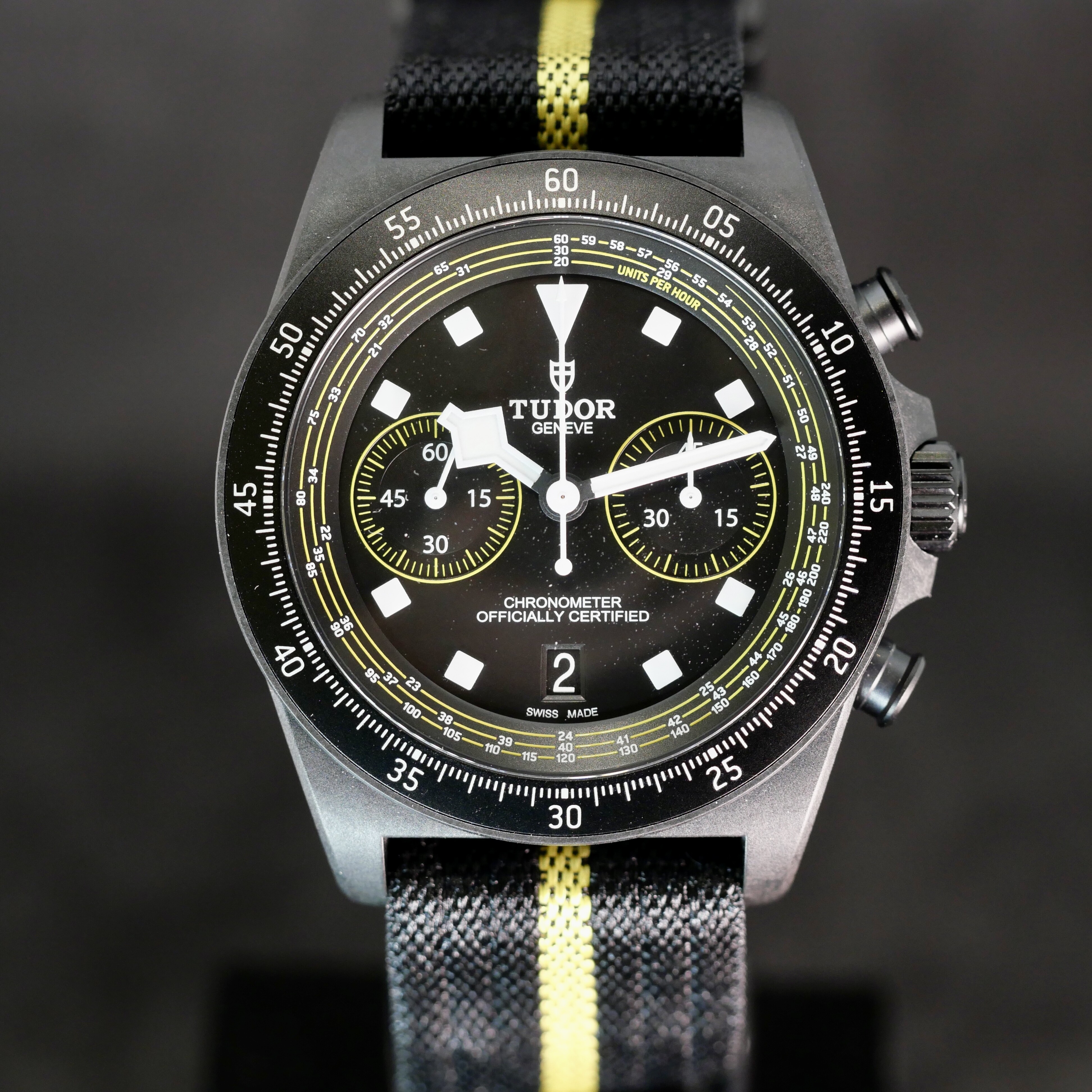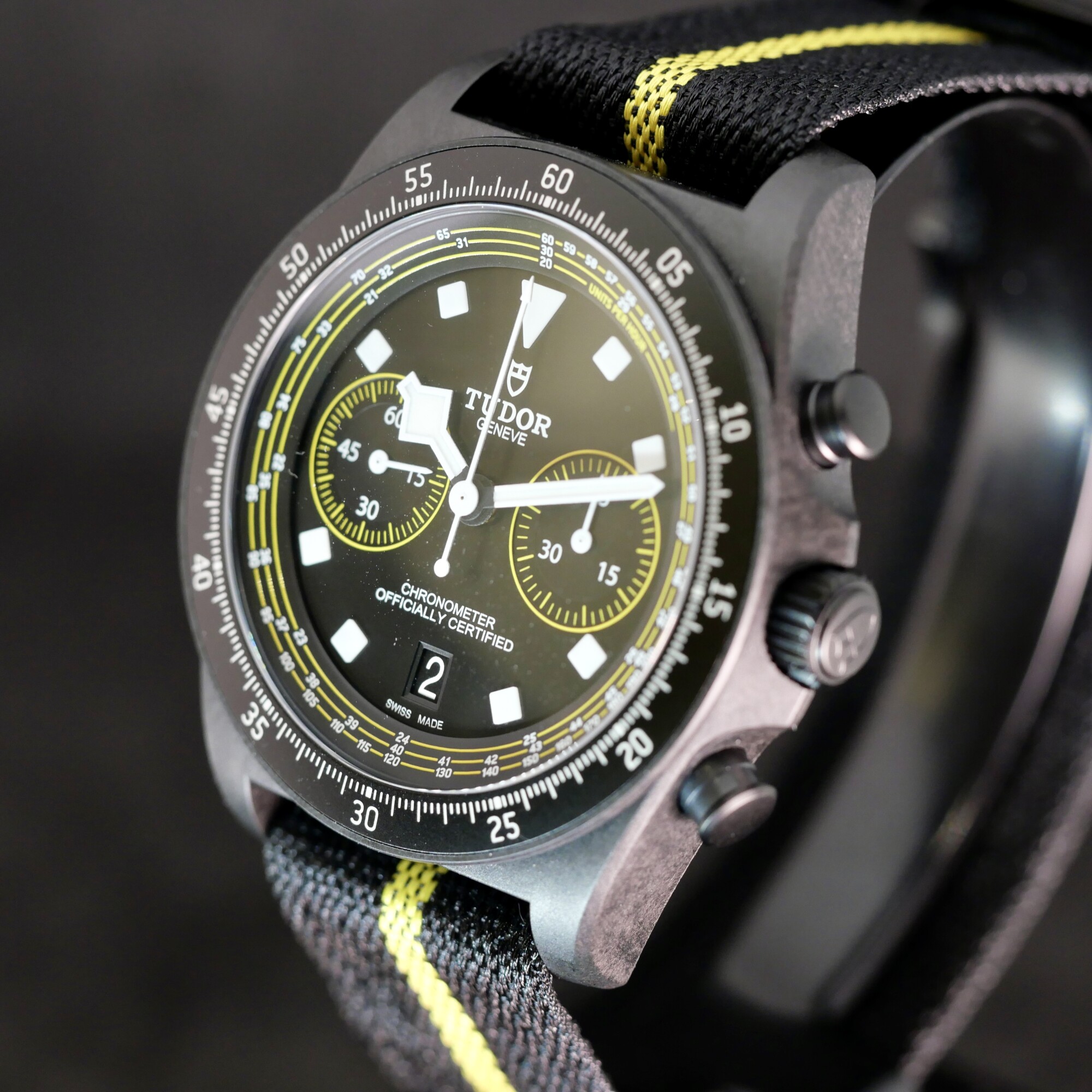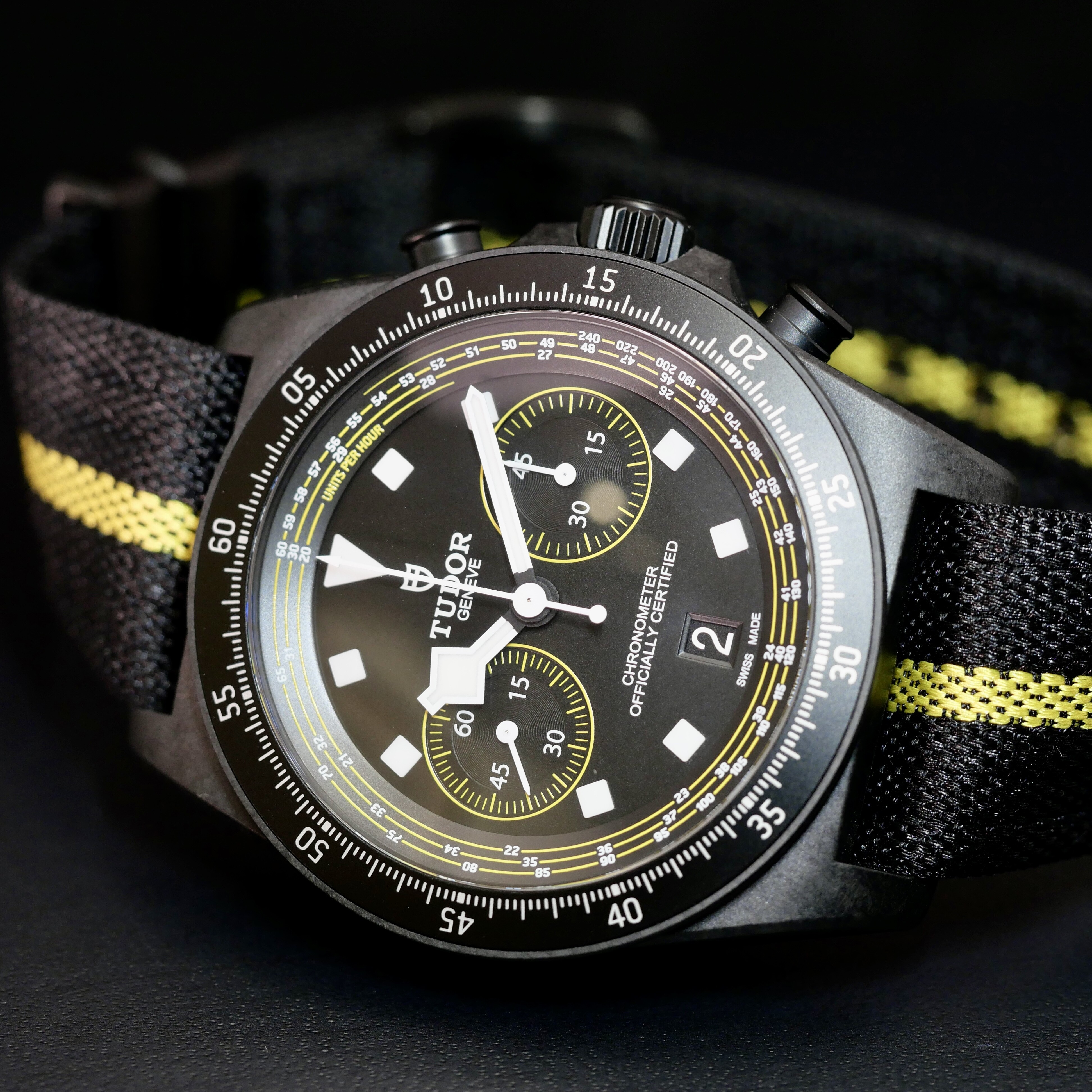 Précision et Fonctionnalités Cyclistes Au-delà de son esthétique audacieuse, ce chronographe se distingue par son échelle tachymétrique spécifiquement adaptée aux vitesses du cyclisme, permettant de suivre les performances avec une précision chirurgicale. Le cadran noir mat est dynamisé par des touches de jaune vif, clin d'œil aux couleurs de l'équipe Tudor Pro Cycling et du leader de la course.