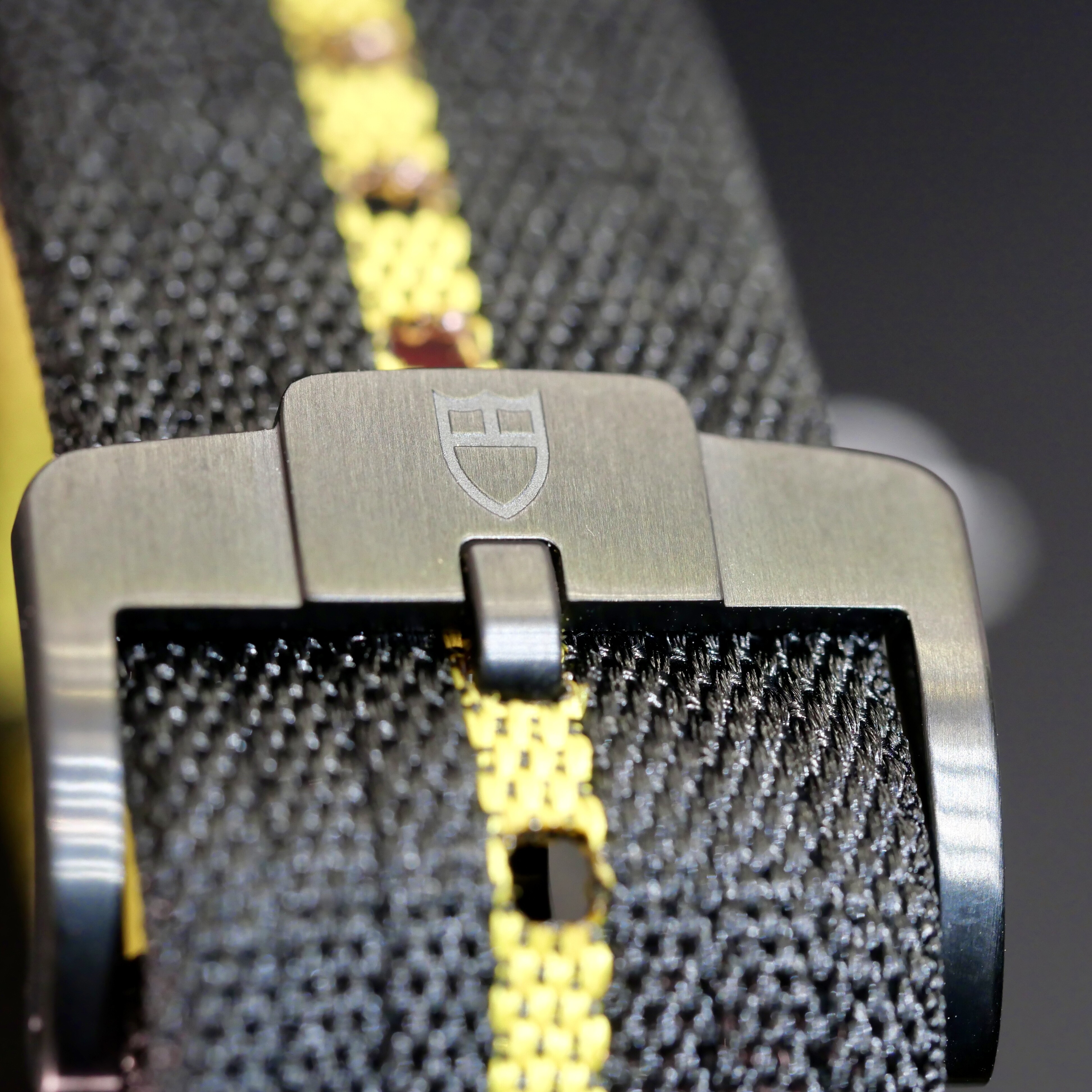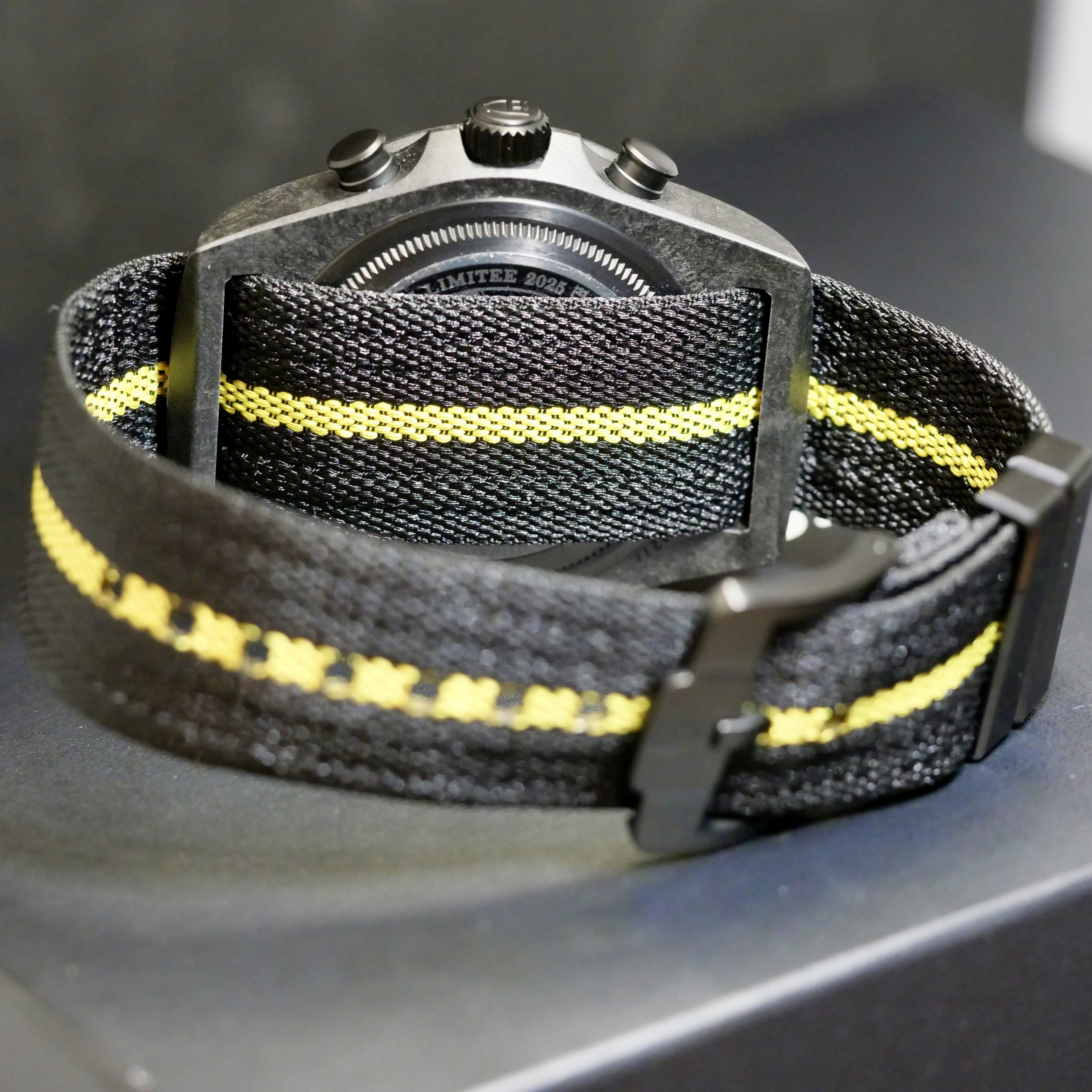 La montre est montée sur un bracelet technique en tissu noir, rehaussé d'un liseré jaune, doté d'une boucle ardillon qui s'adapte parfaitement à toutes les morphologies de poignet. Son étanchéité à 200 mètres et sa lunette noir font de ce modèle un outil aussi polyvalent qu'exclusif.